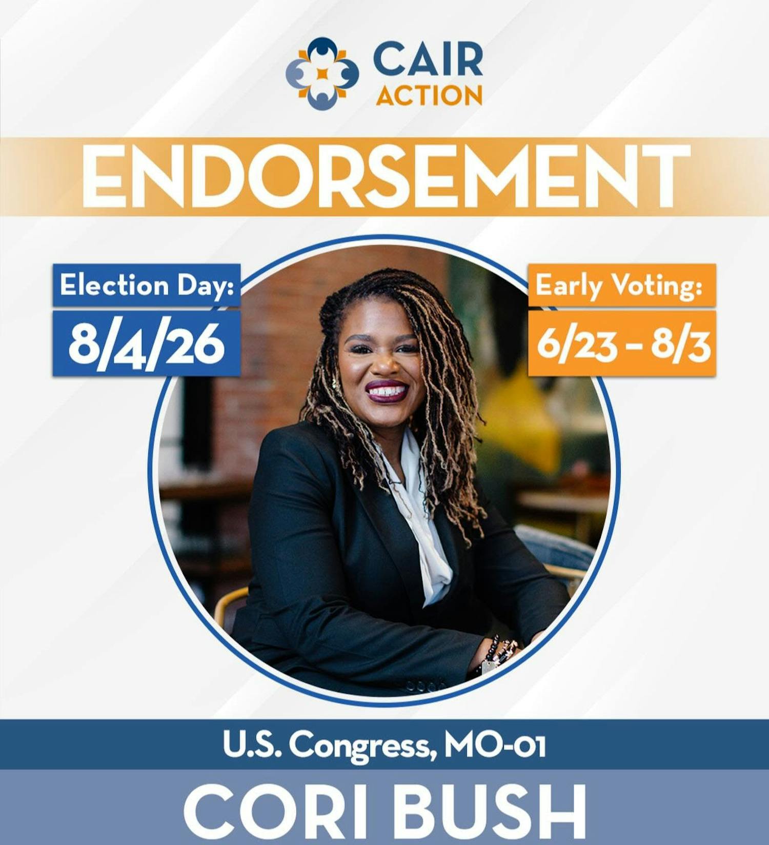 ST. LOUIS, MO — Last week, Congresswoman Cori Bush celebrated an endorsement from CAIR Action; 501(c)(4) affiliate of the Council on American-Islamic Relations (CAIR). They join other early endorsers, including Our Revolution, Justice Democrats, St. Louis DSA, Jewish Voice for Peace Action, Progressive Jews of St. Louis, National Nurses United, as her grassroots campaign to win back her seat in Missouri's 1st District continues to gain momentum.
